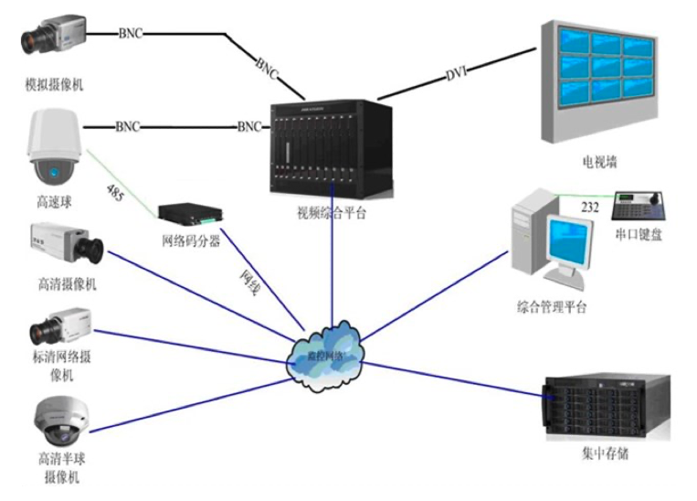 任何規(guī)模、任何形態(tài)、任何階段的視頻監(jiān)控系統(tǒng)都可歸納為:由前端子系統(tǒng)、傳輸子系統(tǒng)、存儲子系統(tǒng)、顯示子系統(tǒng)和控制子系統(tǒng)組成。
