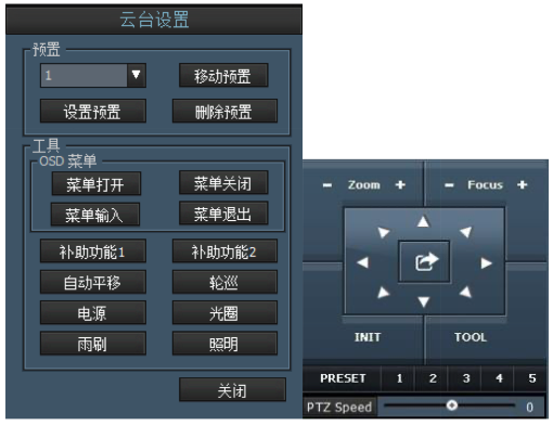 直接在視頻圖像上對攝像機的云臺、一體化球機等設備實現(xiàn)遠程控制:鏡頭變倍、調(diào)焦、云臺轉(zhuǎn)動(上下左右、定位預置點、巡航、調(diào)節(jié)速度、步進控制)等,操作方便,直觀。