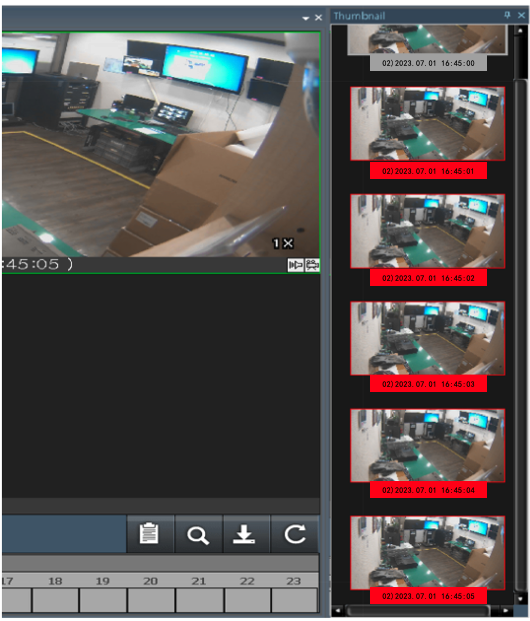 縮略窗口(在一個搜索窗口里):縮略圖能有效地看到每一秒(每一秒的第一幀)的圖像。它能還原第分鐘被丟掉的圖像。當你選擇其它攝像機時,它一樣能恢復。如果你點擊一個縮略圖時,它會顯示暫停。如果你想選擇你前一個時間點,雙擊縮略圖。一定時間間隔的縮略圖功能使得可以細分時間以識別事件發(fā)生時的確切時刻,對龐大存檔中的視頻進行搜索可以在幾秒鐘內(nèi)完成,可以讓用戶自行設置不同的時間段(如按1小時、幾分鐘,甚至幾秒鐘)來對錄像資料進行搜索,大大減輕了工作人員的操作難度,提高工作人員的管理效率。